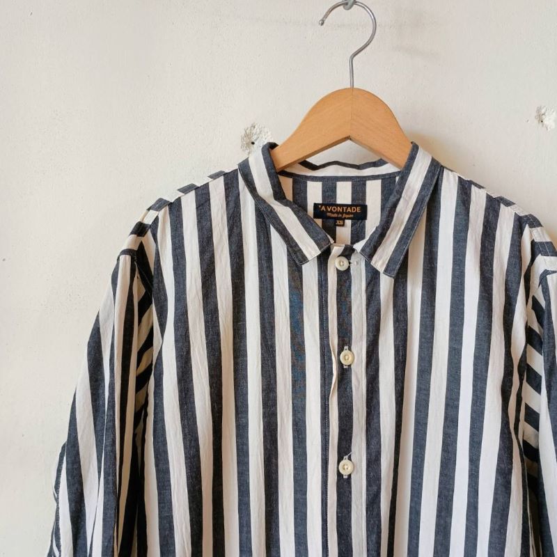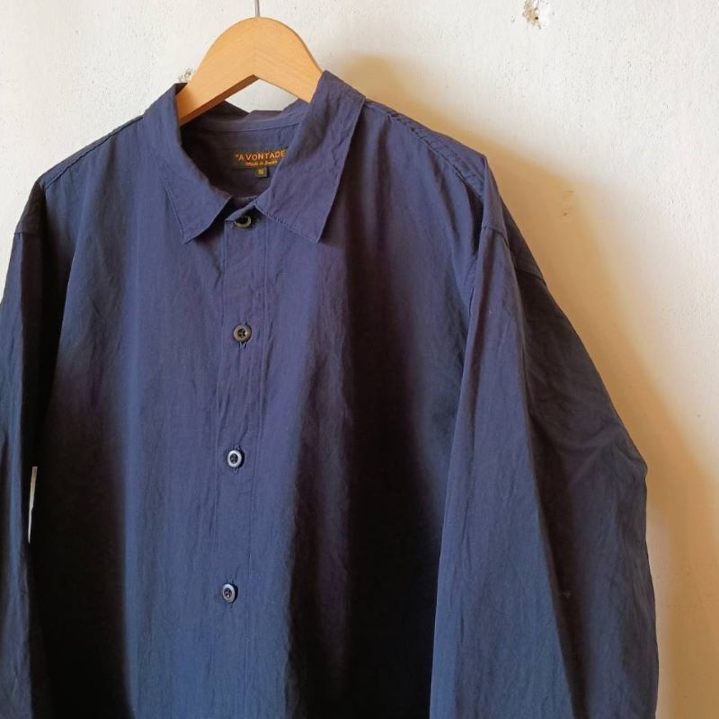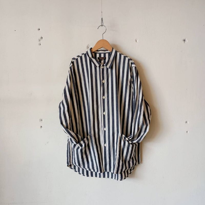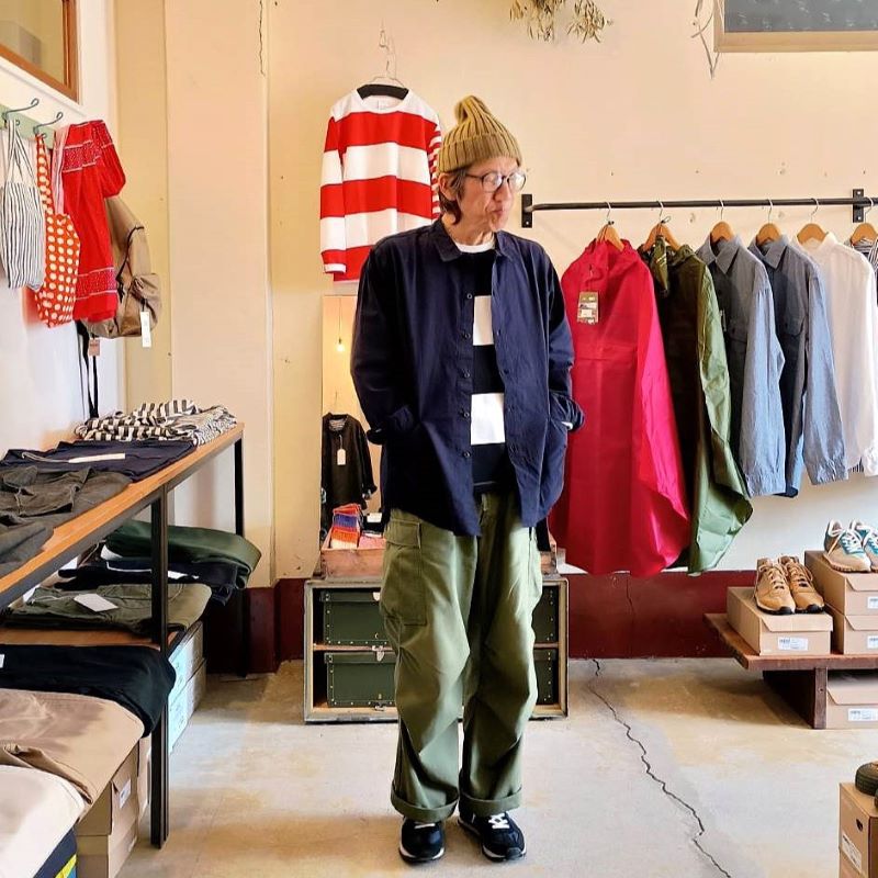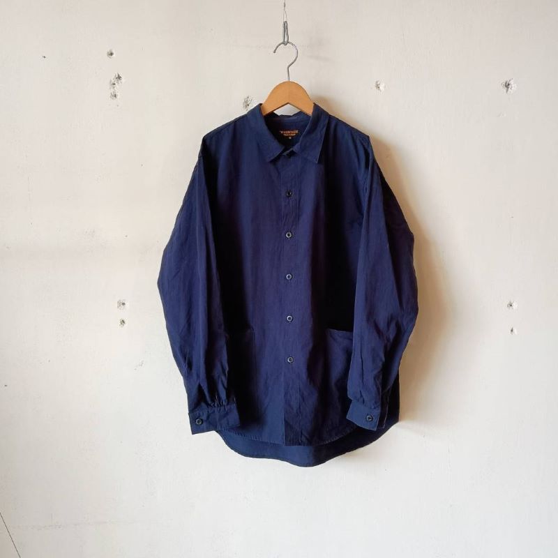おおきなパッチポケットが印象的な「エプロンシャツ」です。